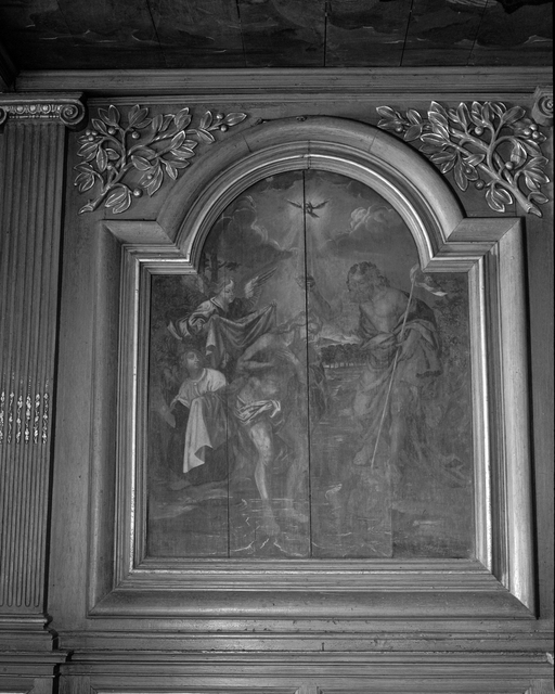 Fonts baptismaux, clôture des fonts baptismaux, retable des fonts baptismaux, baldaquin des fonts baptismaux, église paroissiale Saint-Melaine (Cornillé),