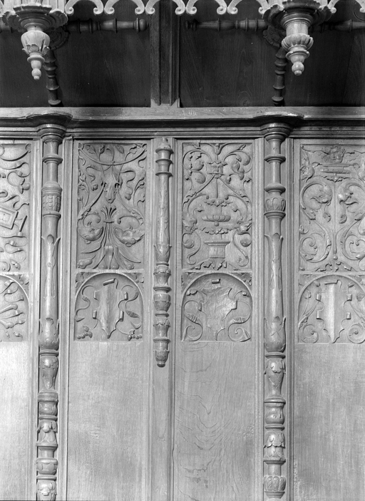 Stalles nord, dossier 3, détail panneaux supérieurs.Immatriculation