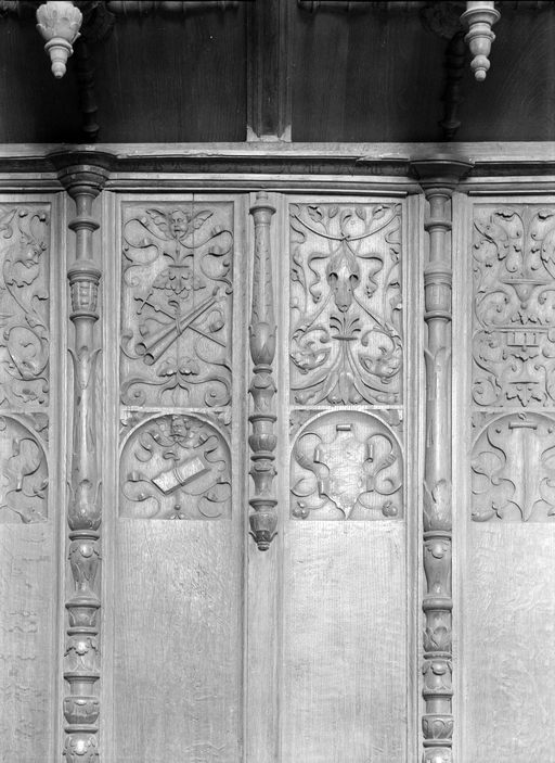 Stalles nord, dossier 10, détail panneaux supérieurs.Immatriculation