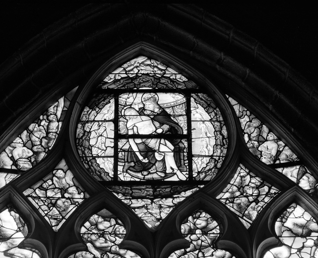 Le Crucifiement, mort de Marie Madeleine, Trinité (baie n°0) : Détail du panneau Trinité, sommet du réseau.Immatriculation