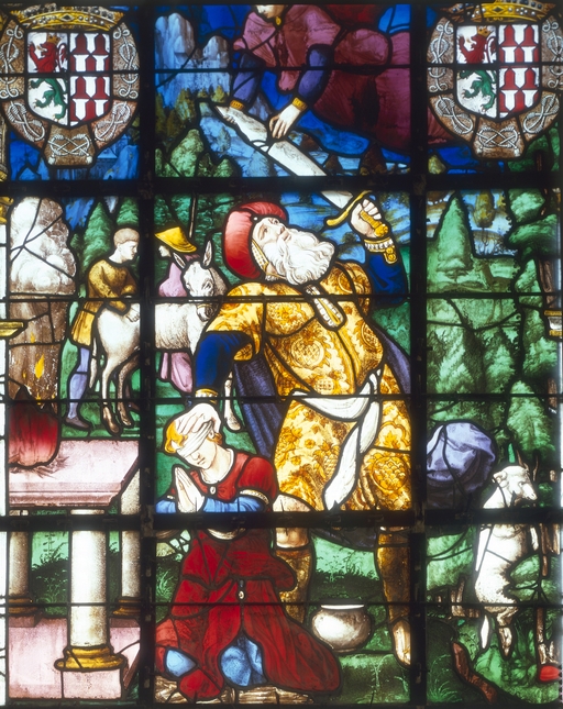 Verrière (verrière à personnages) : sacrifice d'abraham (baie 2), ancienne collégiale, actuellement église Sainte-Marie-Madeleine (Champeaux),