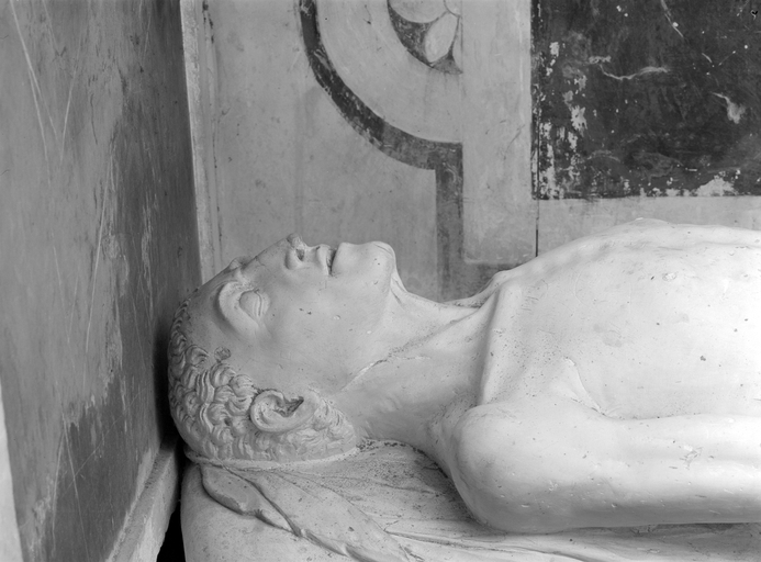 Statue dans tombeau représentant Guy gisant, détail de la tête.Immatriculation