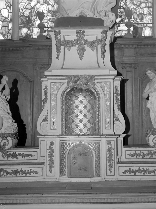 Autel, devant d'autel, gradin d'autel, tabernacle, exposition, statues (2) (maître-autel, tabernacle à dais d'exposition), ancienne collégiale, actuellement église Sainte-Marie-Madeleine (Champeaux),