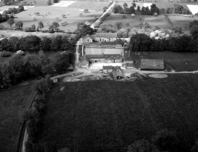 Vue aérienne ; manoir au 2e plan ; état en 1975Immatriculation