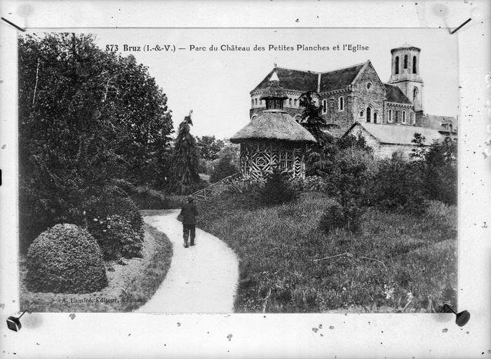 873. Bruz (I. et V.) - Parc du château des petites Planches et l'église, carte postale ancienne.Immatriculation
