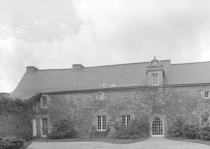 Manoir, aile ouest : élévation est (état en 1984) ; la composition de la façade indique qu'il s'agissaitt d'un ancien logis à salle basse sous charpente, transformé par la suiteImmatriculation