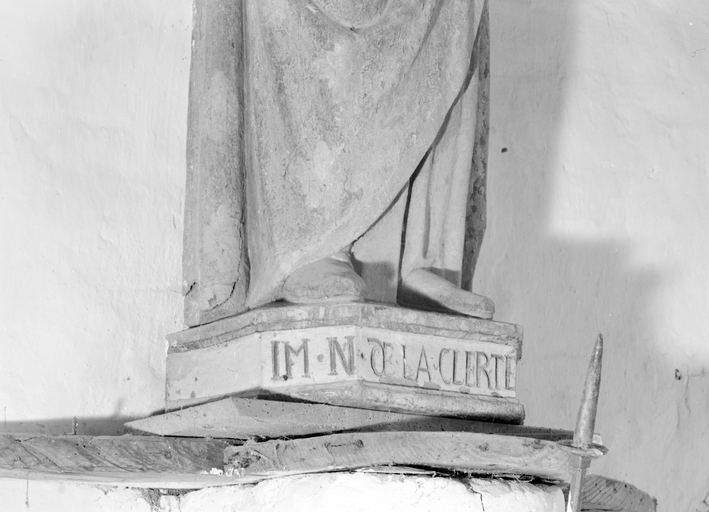 Statue de Vierge à l'Enfant, base avec inscription, détail.Immatriculation