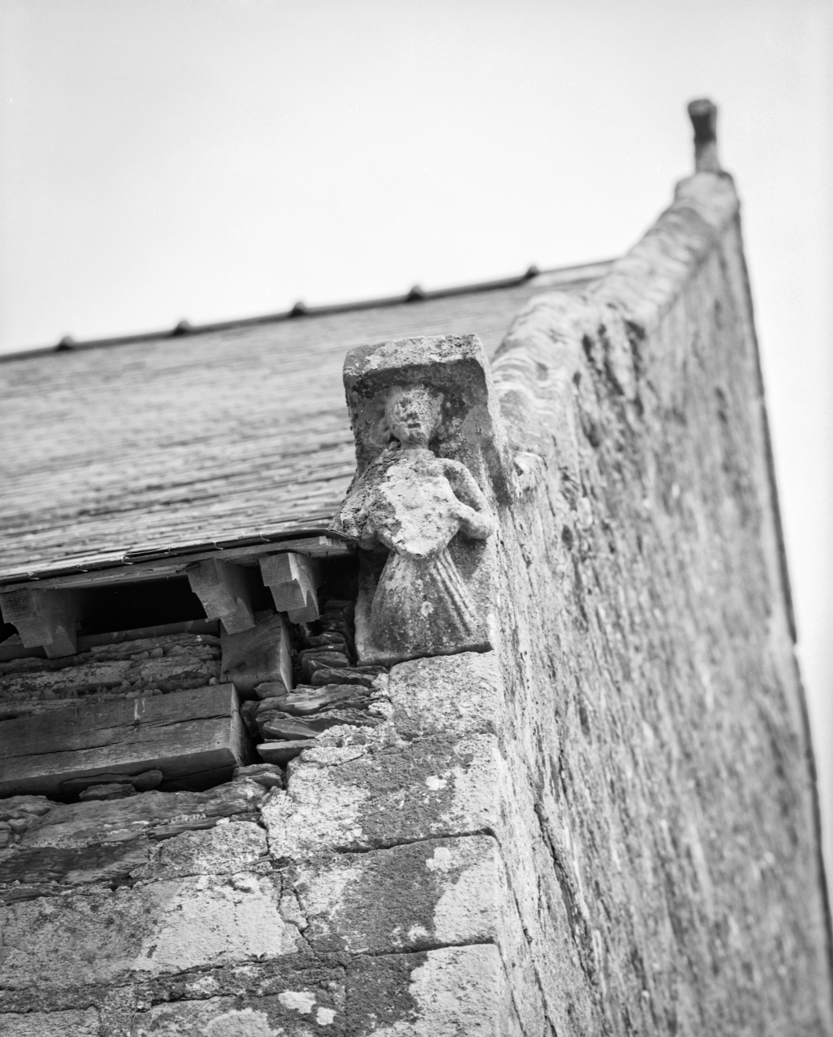 Chapelle, sur le rampant sud-est : crossette sculptée d'un ange portant des armoiries (état en 1984)Immatriculation