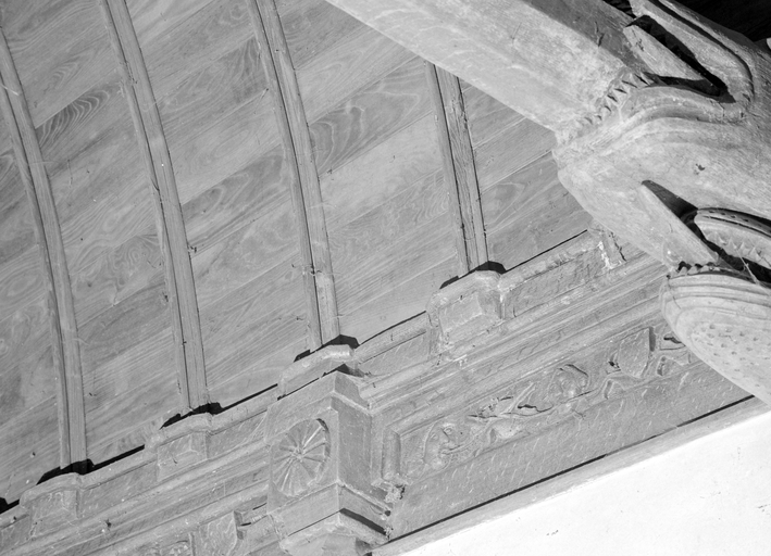 Château, chapelle : sablière décorée de masques et d'écussons ; à droite, deux engoulants d'où sort l'entrait (état en 1984)Immatriculation