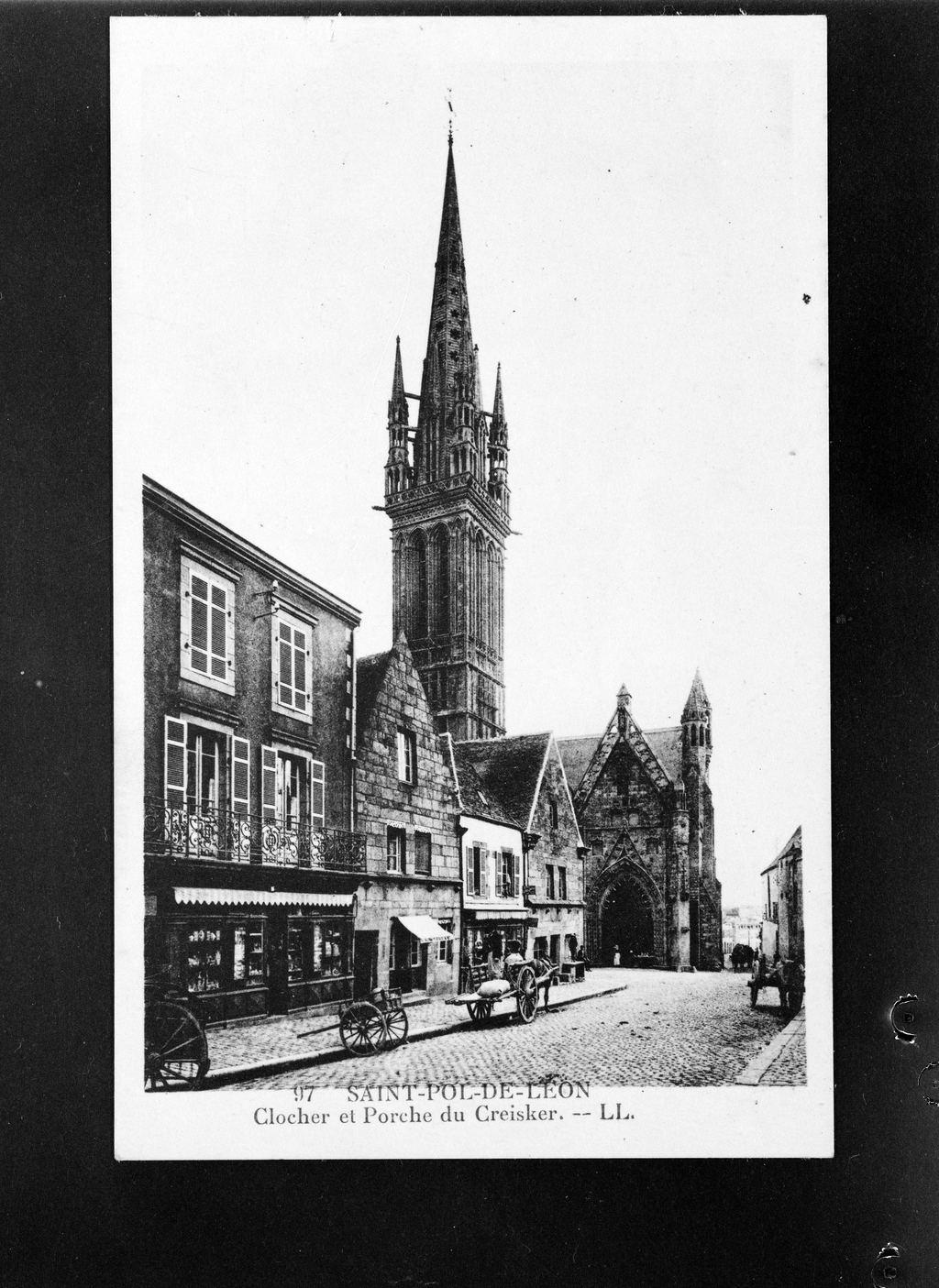 Clocher et porche du Creisker. Repro. Carte postale ancienne (A.D. Finistère)Immatriculation