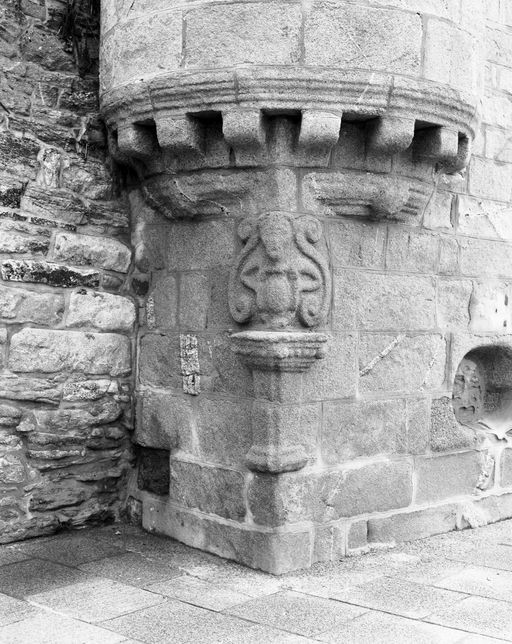 Vue générale depuis le sud-est : tourelle, détail des sculptures à la base (état en 1985)Immatriculation