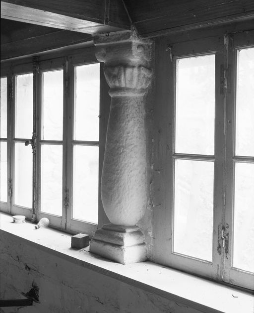 Vue générale prise de la porte d'entrée en enfilade : galerie, détail de l'une des colonettes au chapiteau orné (état en 1985)Immatriculation
