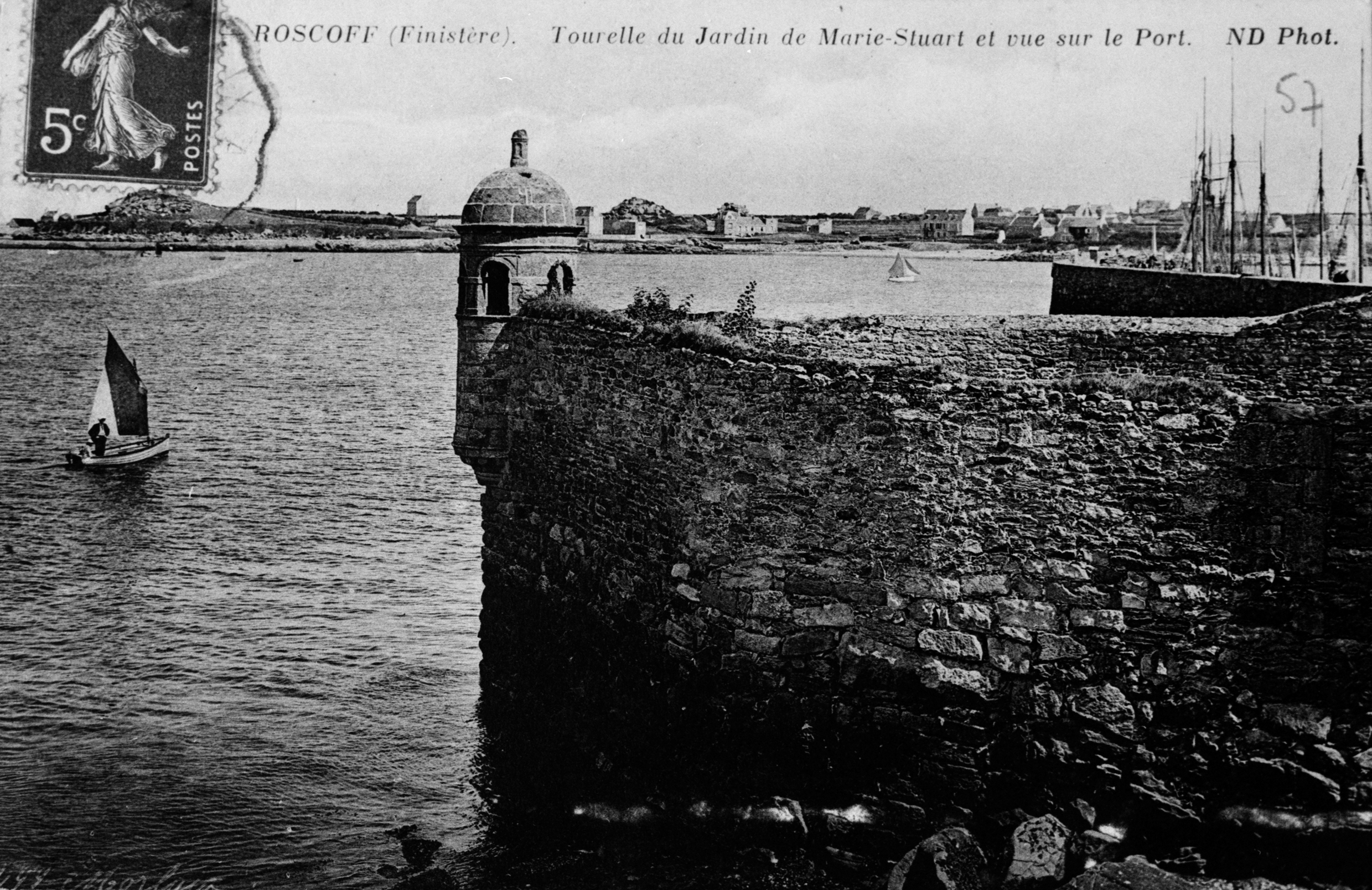 Vue de situation depuis le nord de la maison dite de Marie Stuart (25 rue Amiral-Réveillère), carte postale antérieure à la création du Quai neuf (ND Phot.). Mur de clôture et échauguette/guérite dominaient la merImmatriculation