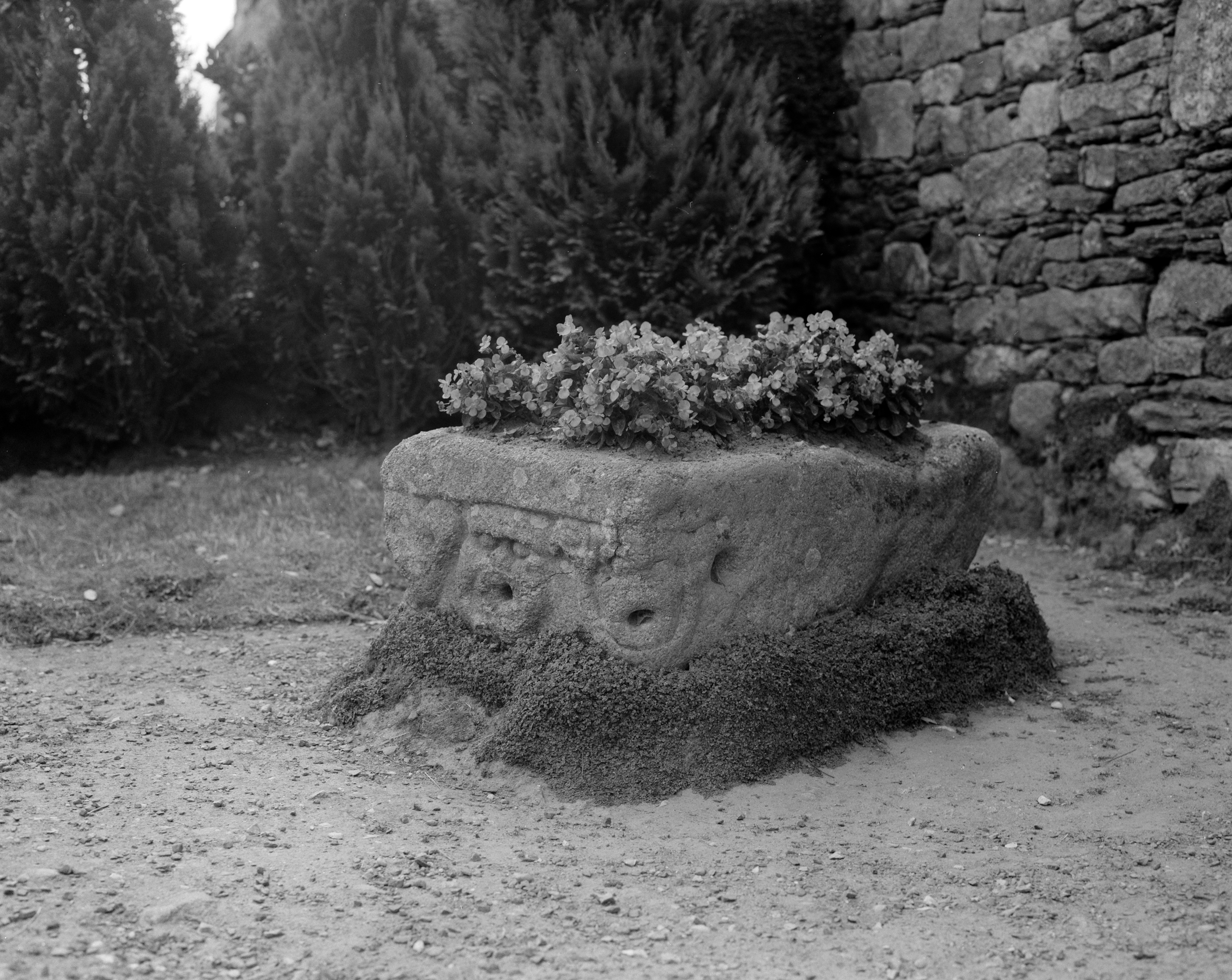 Auge devant la maison avec têtes sculptéesImmatriculation