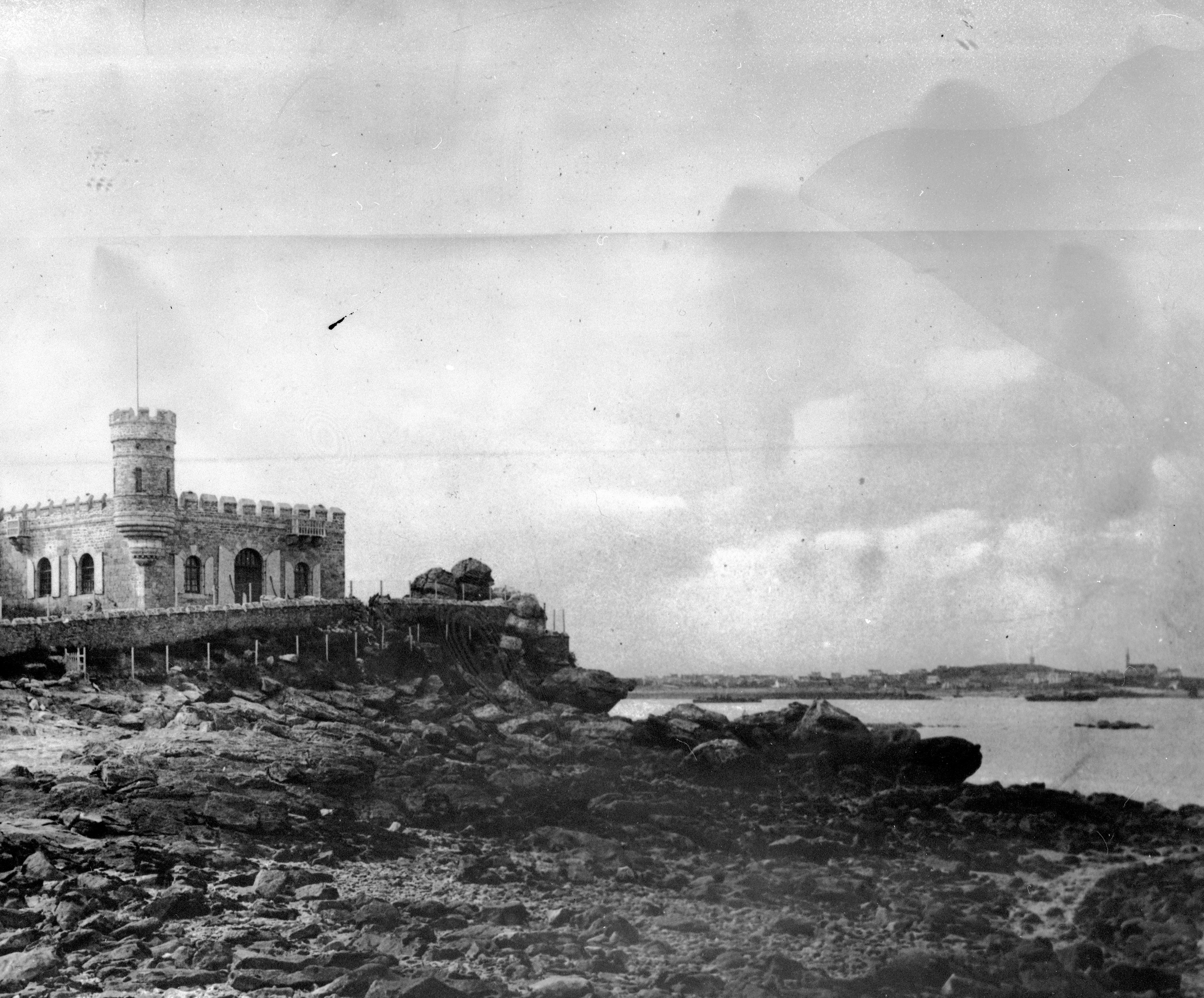 Vue générale à marée basse, vers 1914, carte postale. L'ancien corps de garde est flanqué d'une tour créneléeImmatriculation