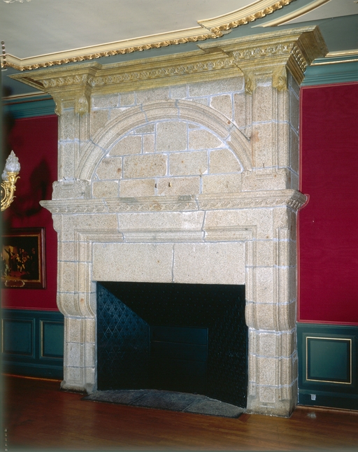 Vue générale de la cheminée du mur nord dans la salle des mariages.Immatriculation
