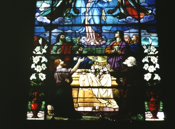 Verrière (5, verrière figurée) : cène, sainte Famille, résurrection, apparition du Sacré-coeur à sainte Marguerite-Marie alacoque, Assomption (baies 1,2,3,4,6),
