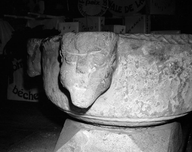 Vasque n°1, vue de détail de tête sculptée.Immatriculation