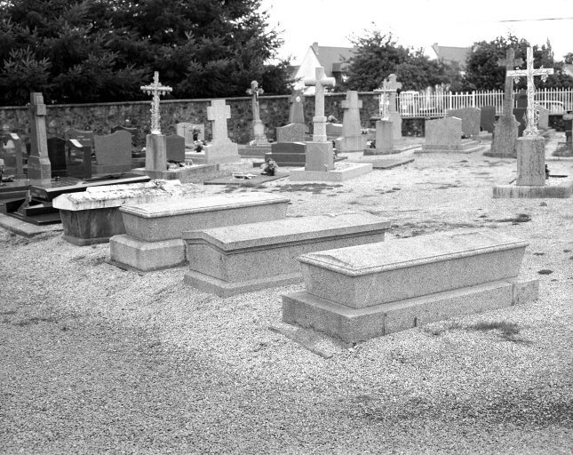Alignement de tombes dans le cimetière, vue générale.Immatriculation