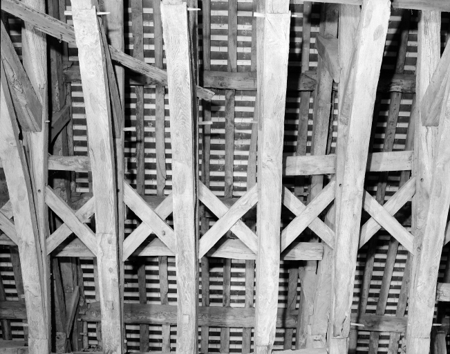 Charpente, corps principal : vue de détail chevron.Immatriculation