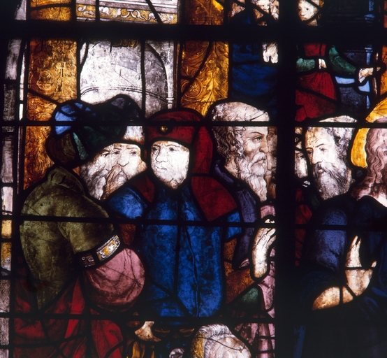 Mur nord, vitrail, la femme adultère : panneau B3.Immatriculation