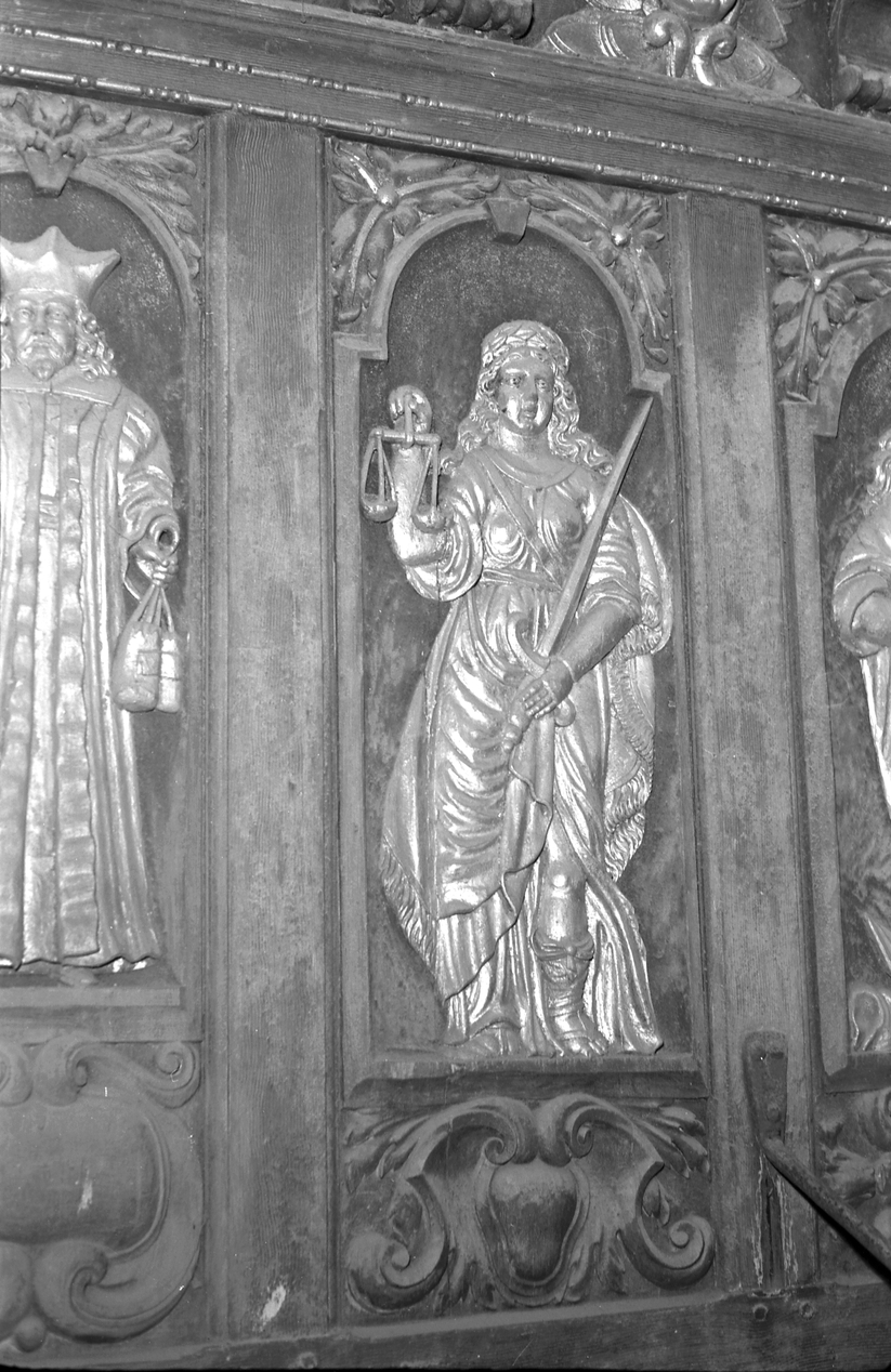 Soubassement du grand buffet, bas-reliefs sculptés et dorés, la Justice.Immatriculation