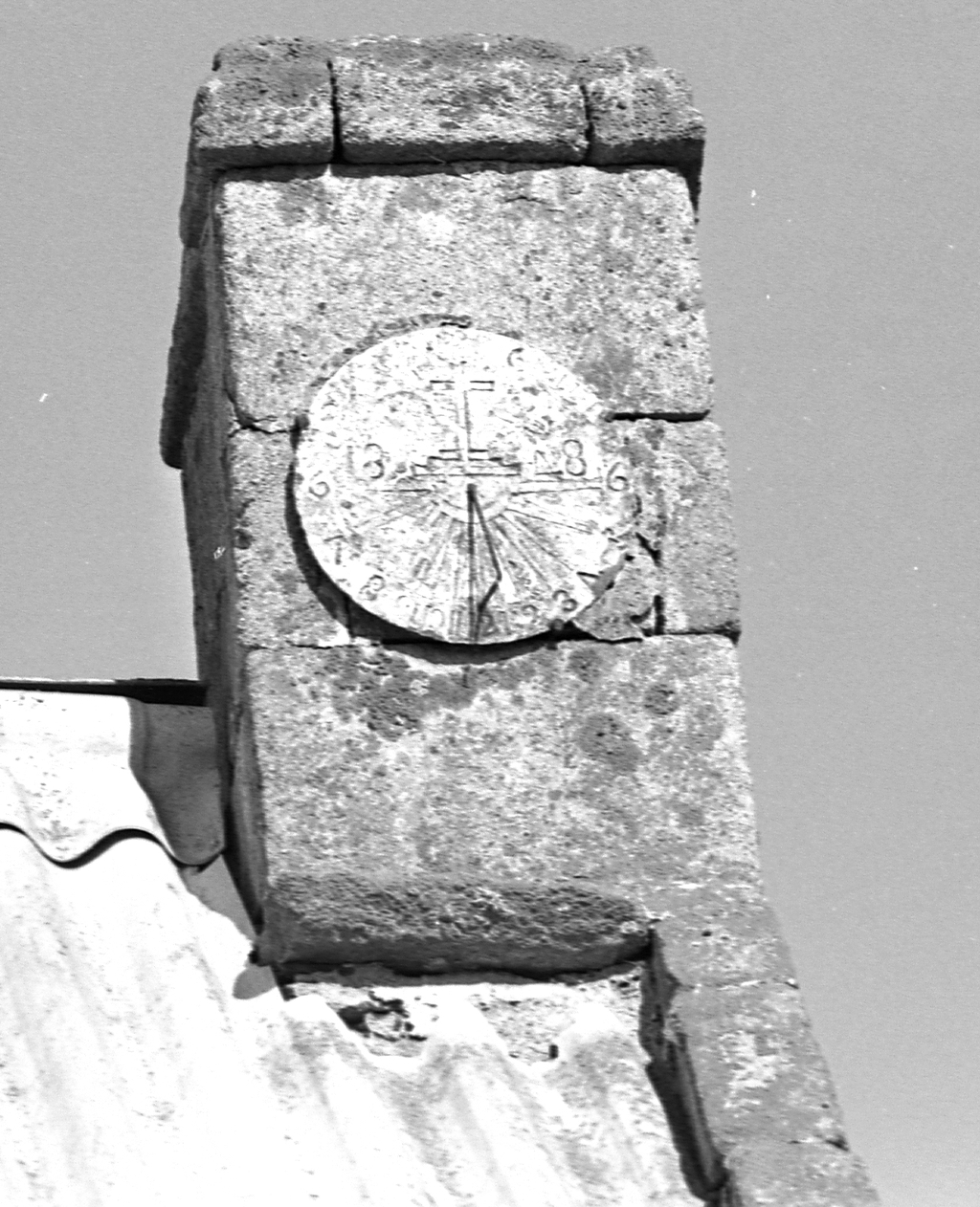 Goulien, ferme. Cadran solaire daté 1828 sur la souche de cheminée est du logis (aujourd'hui disparu). (1986)Immatriculation