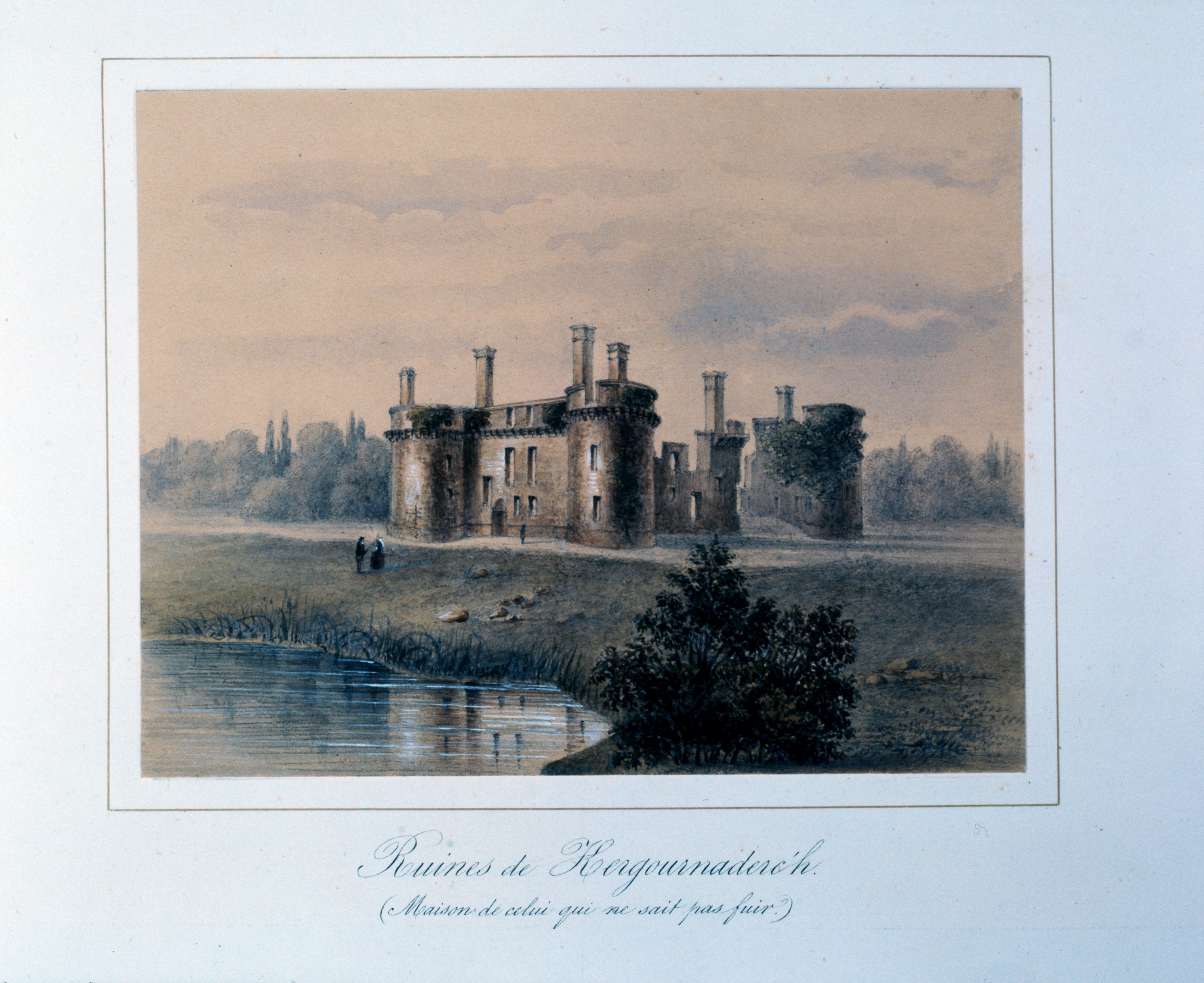 Dessin provenant d'une collection privée, vers 1860 : vue générale depuis le sud (l'éperon de la tour sud a été oublié). Au premier plan, l'étangImmatriculation