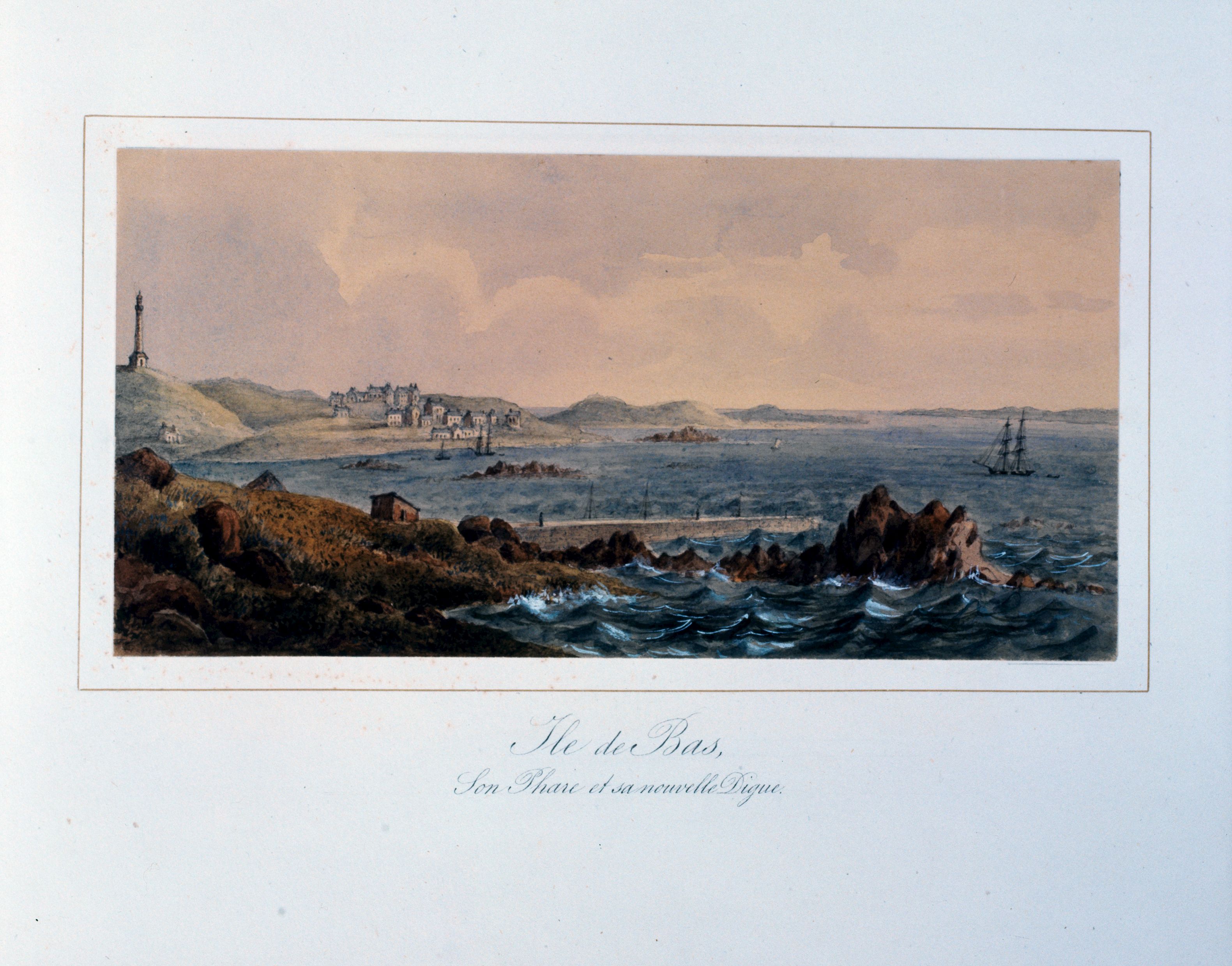 Ile de Bas, son phare et sa nouvelle digue. Aquarelle, collection particulière. Vers 1854.Immatriculation