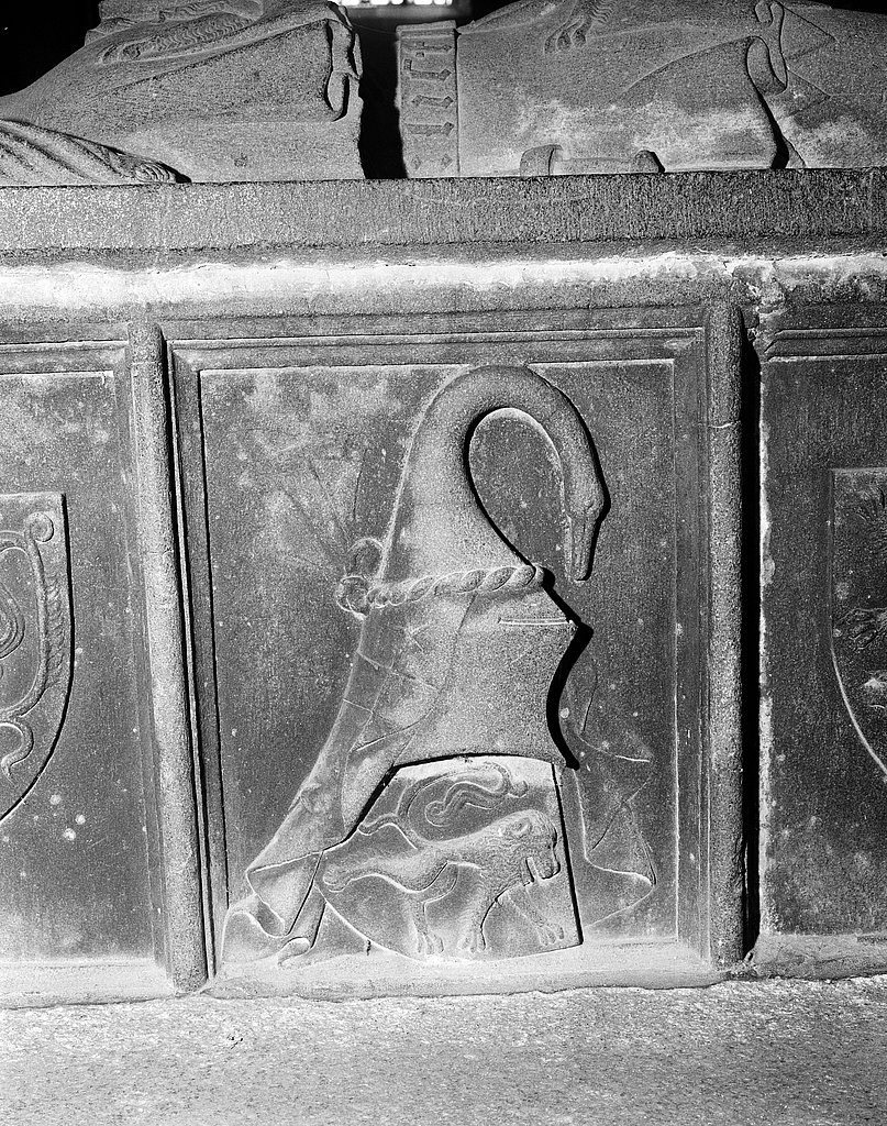 Face sud, panneau avec heaume à col de cygne et lion.Immatriculation