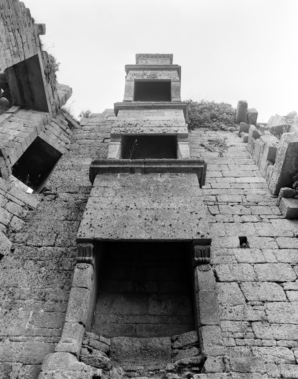 Vue en contreplongée du mur intérieur de la courtine sud-ouest depuis le nord : superposition des cheminées des rez-de-chaussée, premier étage et étage de comble (état en 1986)Immatriculation