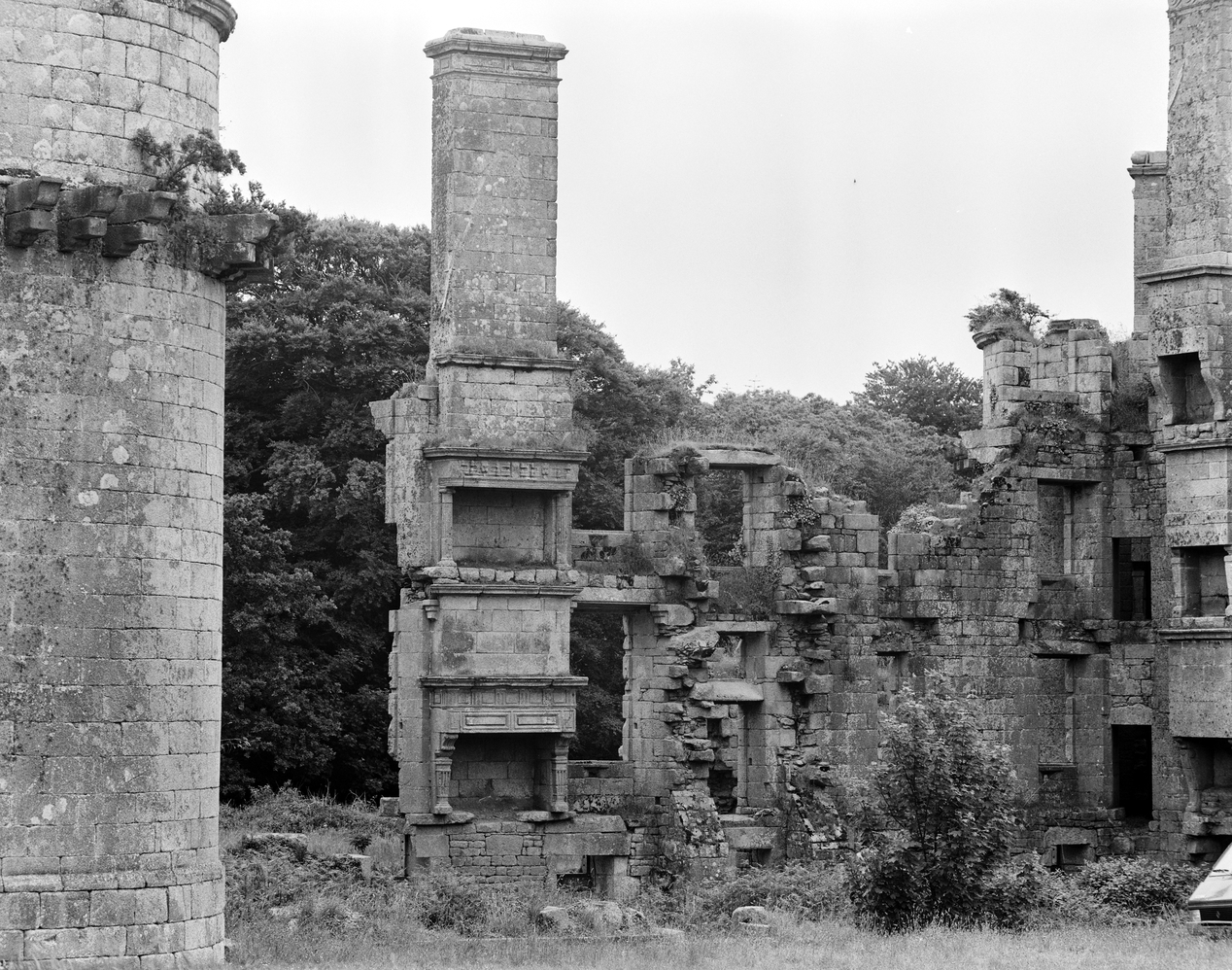 Vue du mur intérieur de la courtine sud-est depuis le nord (état en 1986). Les cheminées correspondent aux deux grandes salles centrales. A l'extrême droite, superposition de trois cheminées (rez-de-chaussée, premier étage et étage de comble). Les souches de cheminée sont ornéesImmatriculation