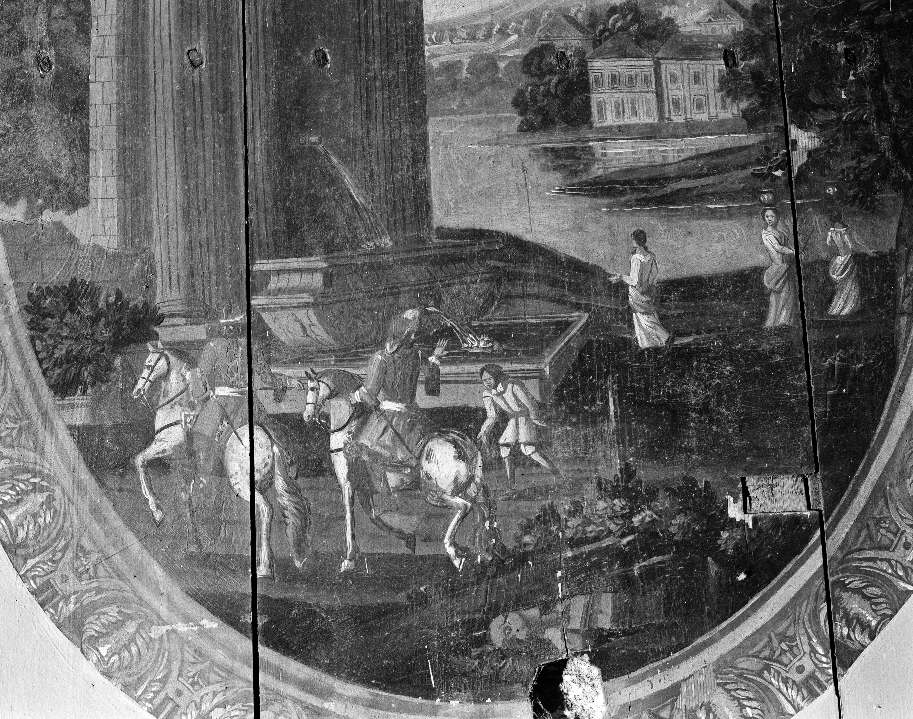 Dessus-de-porte, porte nord, Paysage avec une fontaine monumentale : les personnages (état en 1986)Immatriculation