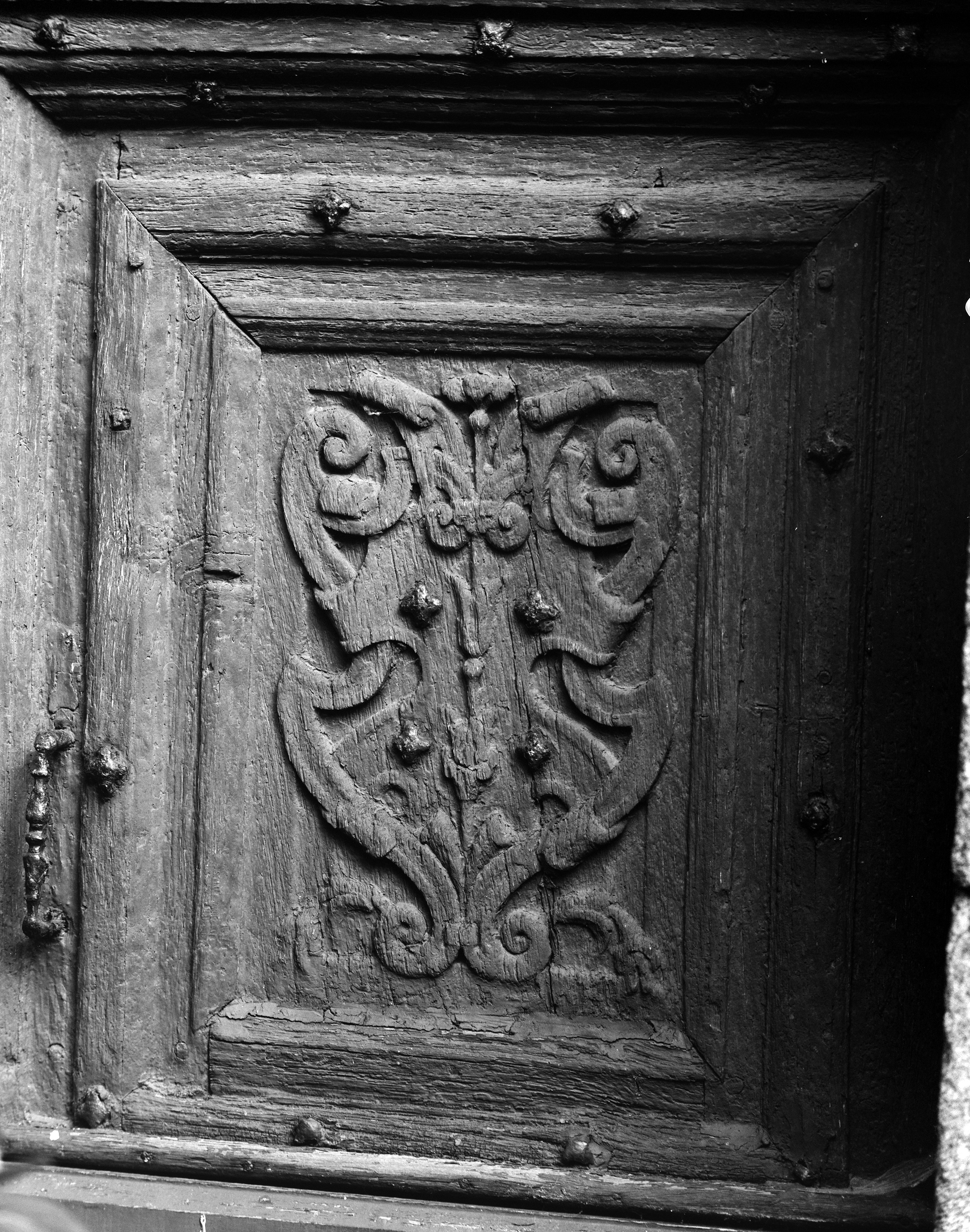 Château, tour d'angle : un panneau sculpté du vantail de la porte (état en 1986)Immatriculation