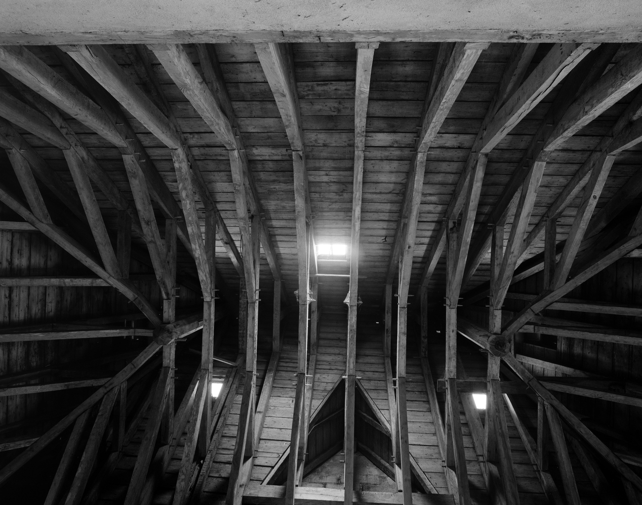 Pavillon d'escalier, dernier niveau, vue générale de la charpenteImmatriculation