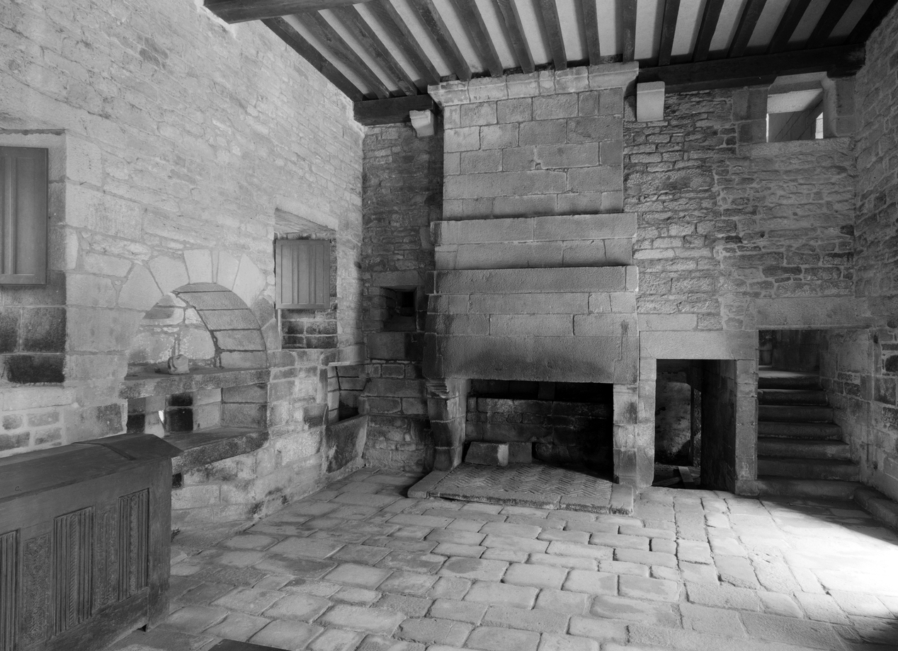Cuisine, cheminée, vue de l'ensemble de la pièce.Immatriculation