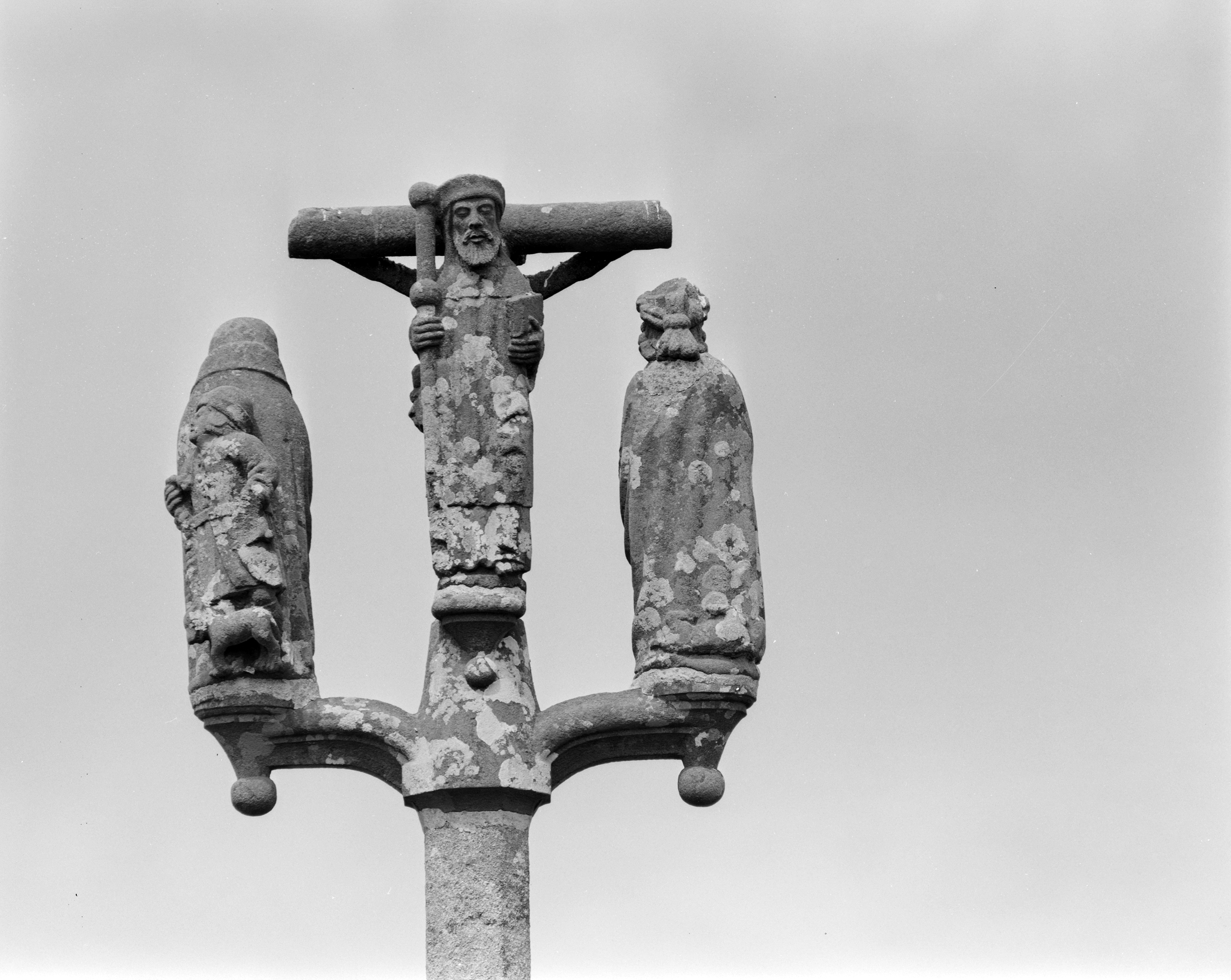 Calvaire : saint Hervé ; à sa droite, sur le croisillon, Guiharan le guide et son chien (état en 1986)Immatriculation