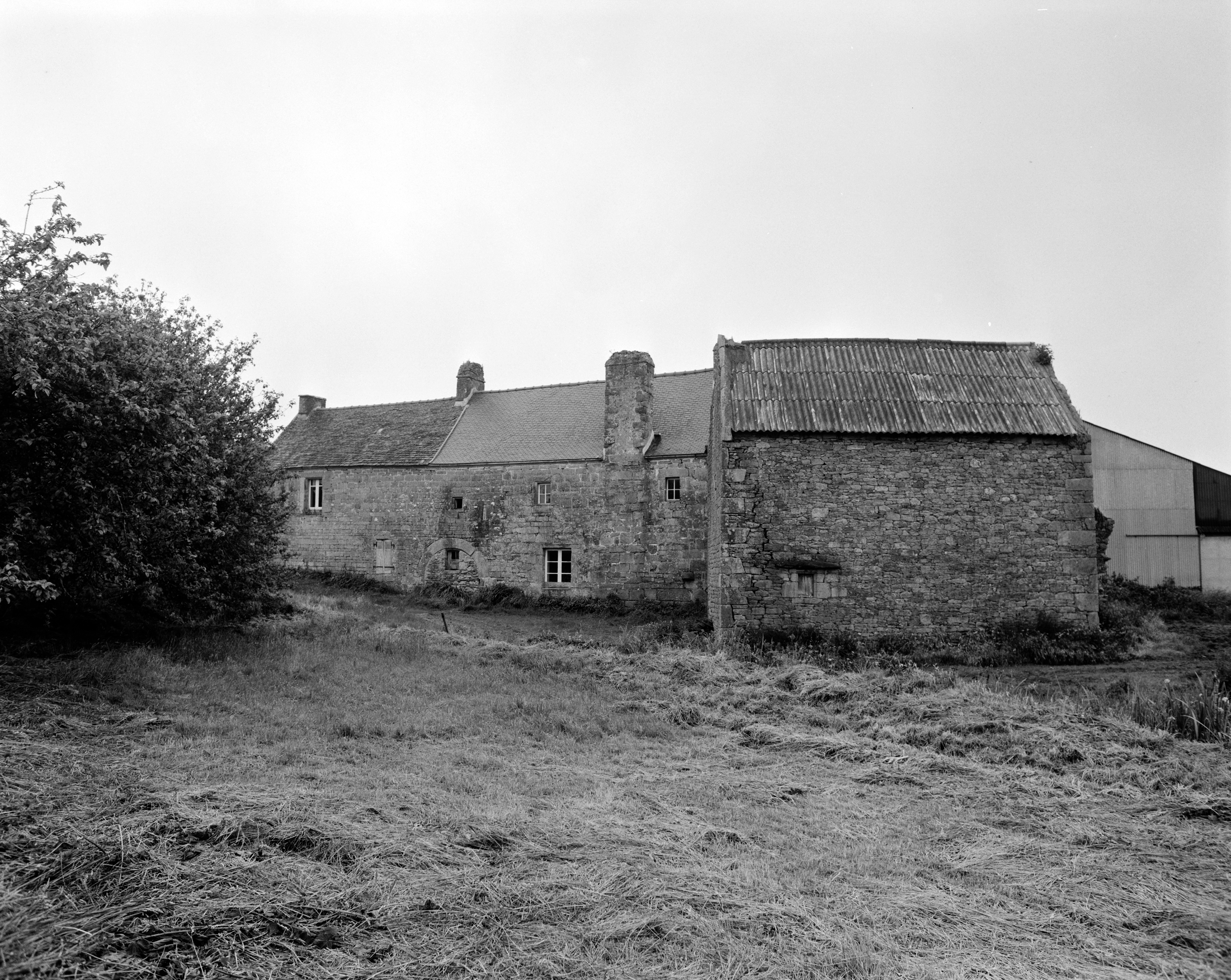 Manoir : élévation nord (bâtiment avec les souches de cheminée) ; au premier plan le bâtiment qui abritait le moulin (état en 1986)Immatriculation