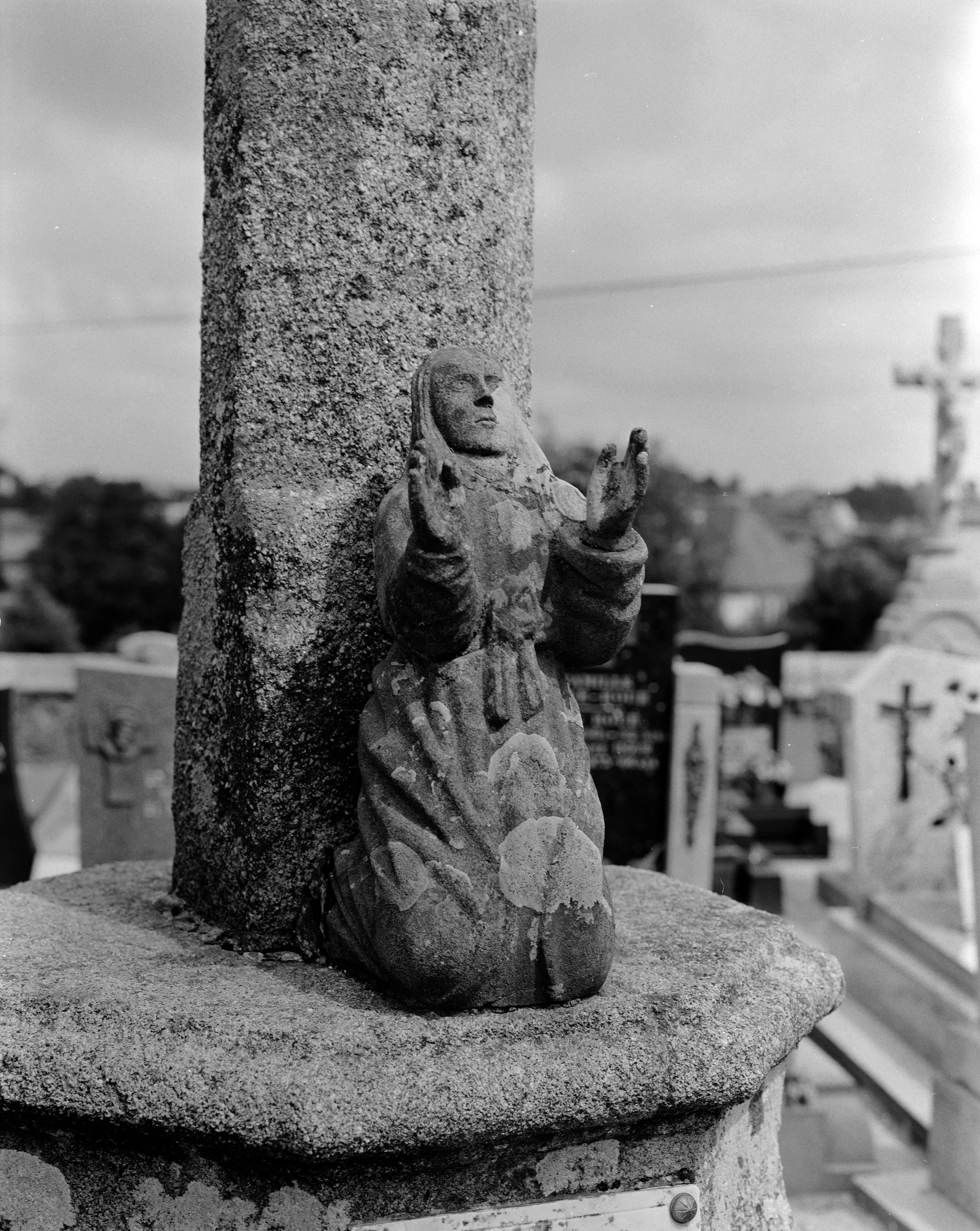 Croix de cimetière, face portant le Calvaire : vue rapprochée de Marie-Madeleine (état en 1986)Immatriculation