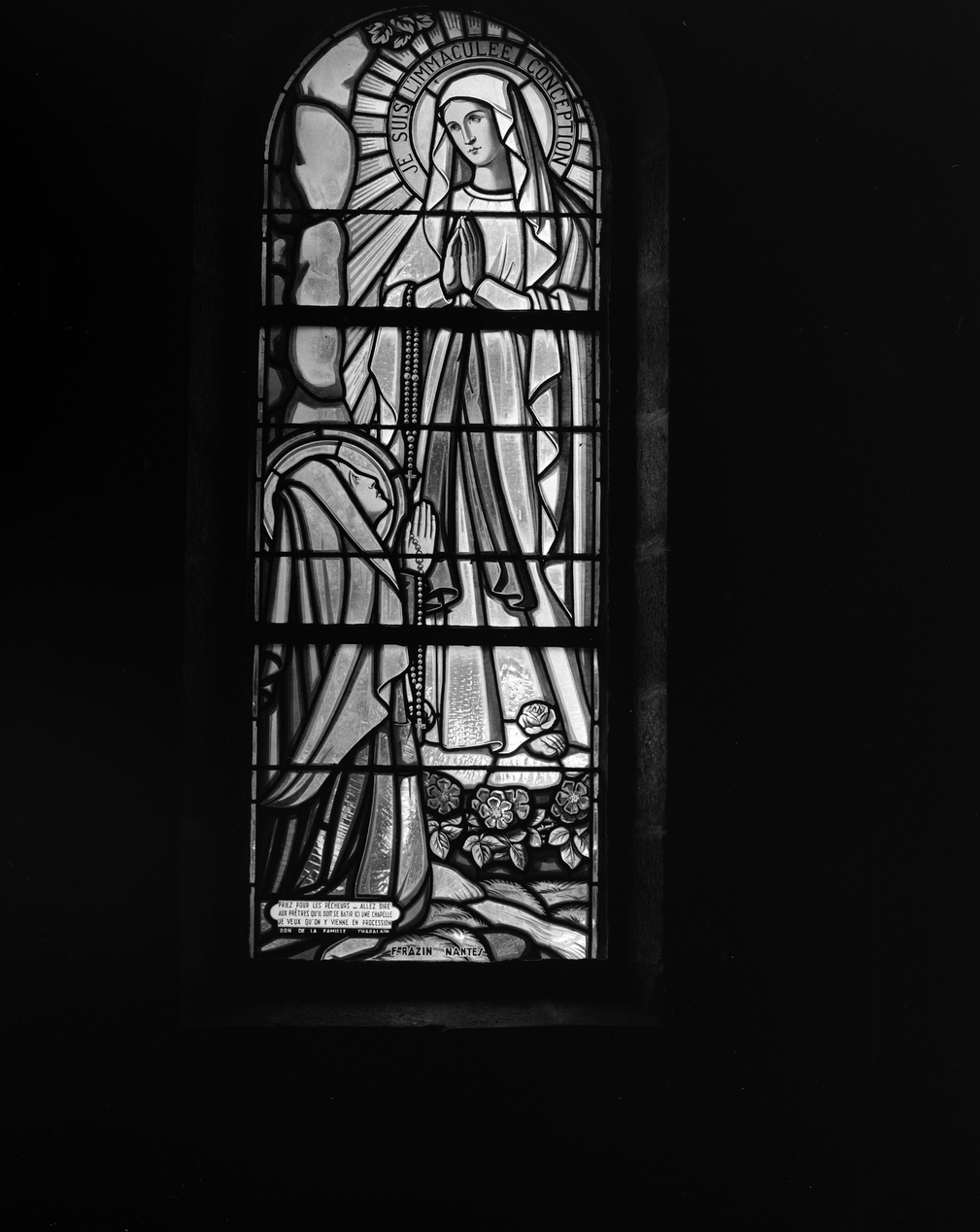 Verrière : Apparition de la Vierge à sainte Bernadette (baie 8), verrière figurée, église paroissiale Notre-Dame (Île-de-Batz),