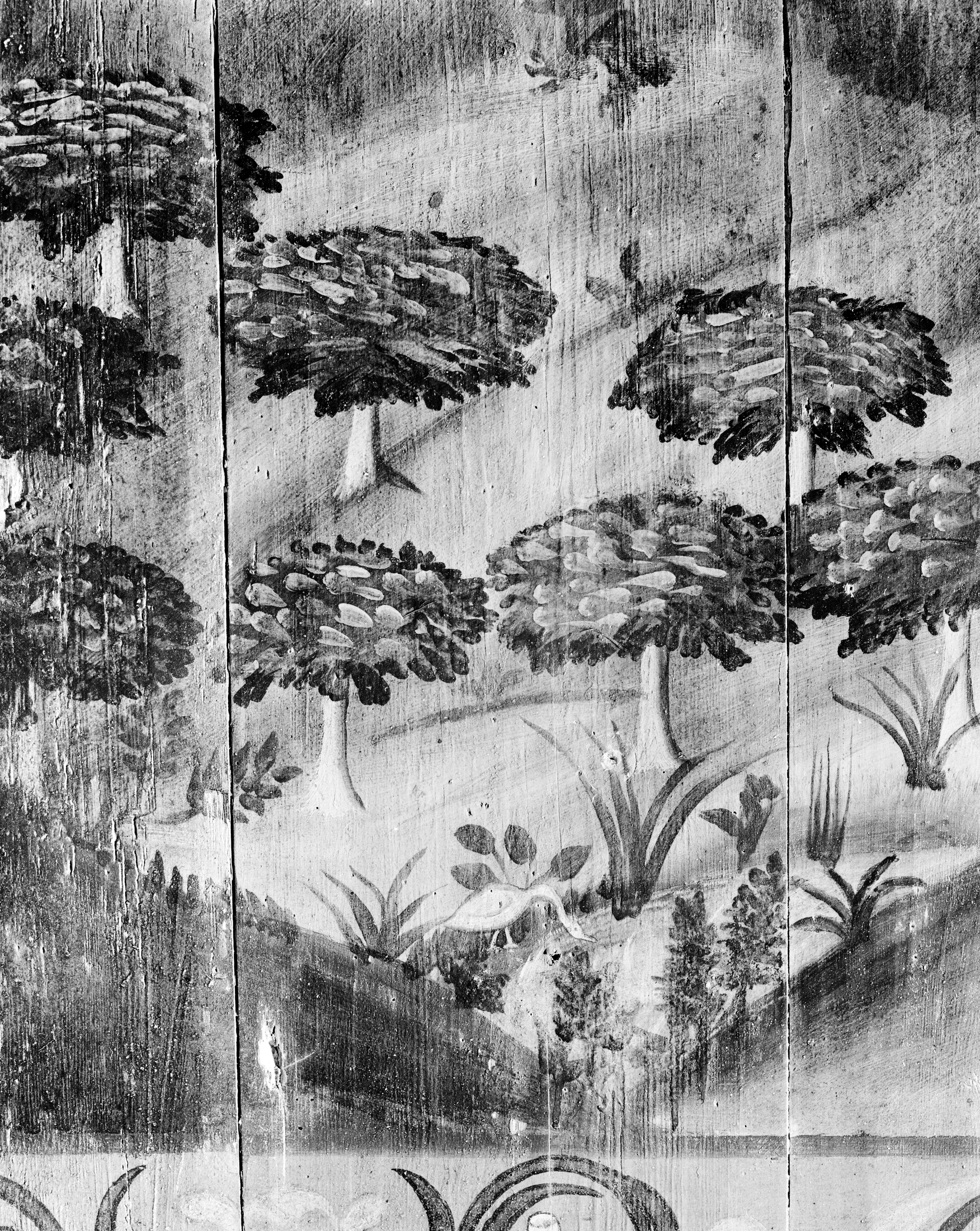 Maison : peintures sur bois, panneau B, détail oiseau et étangImmatriculation