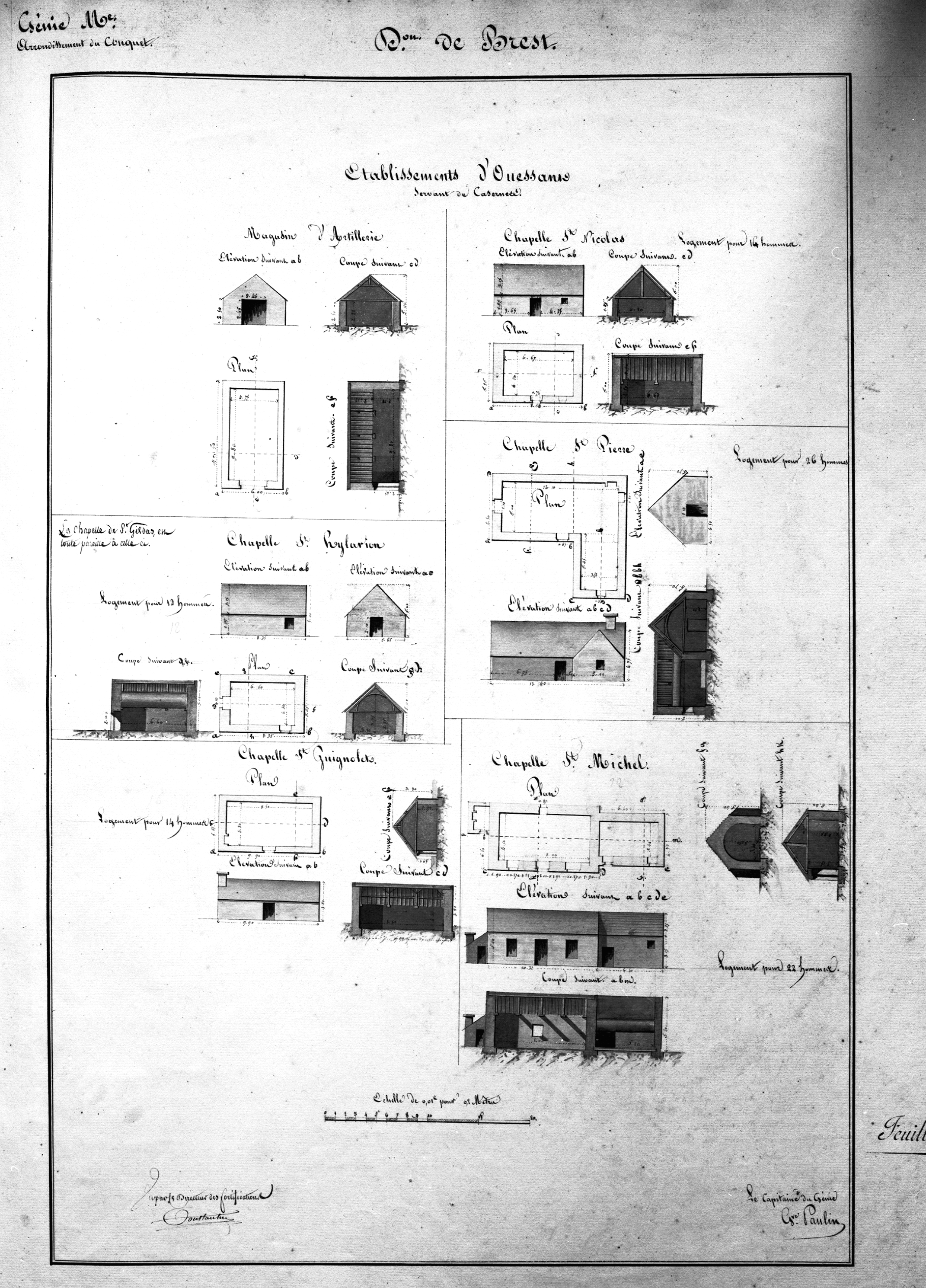 Atlas des bâtiments militaires des places de France : établissements d'Ouessant : magasin d'artillerie, casernements des chapelles St-Nicolas, St-Pierre, St-Gildas, St-Michel, St-Guignolet, vers 1836Immatriculation