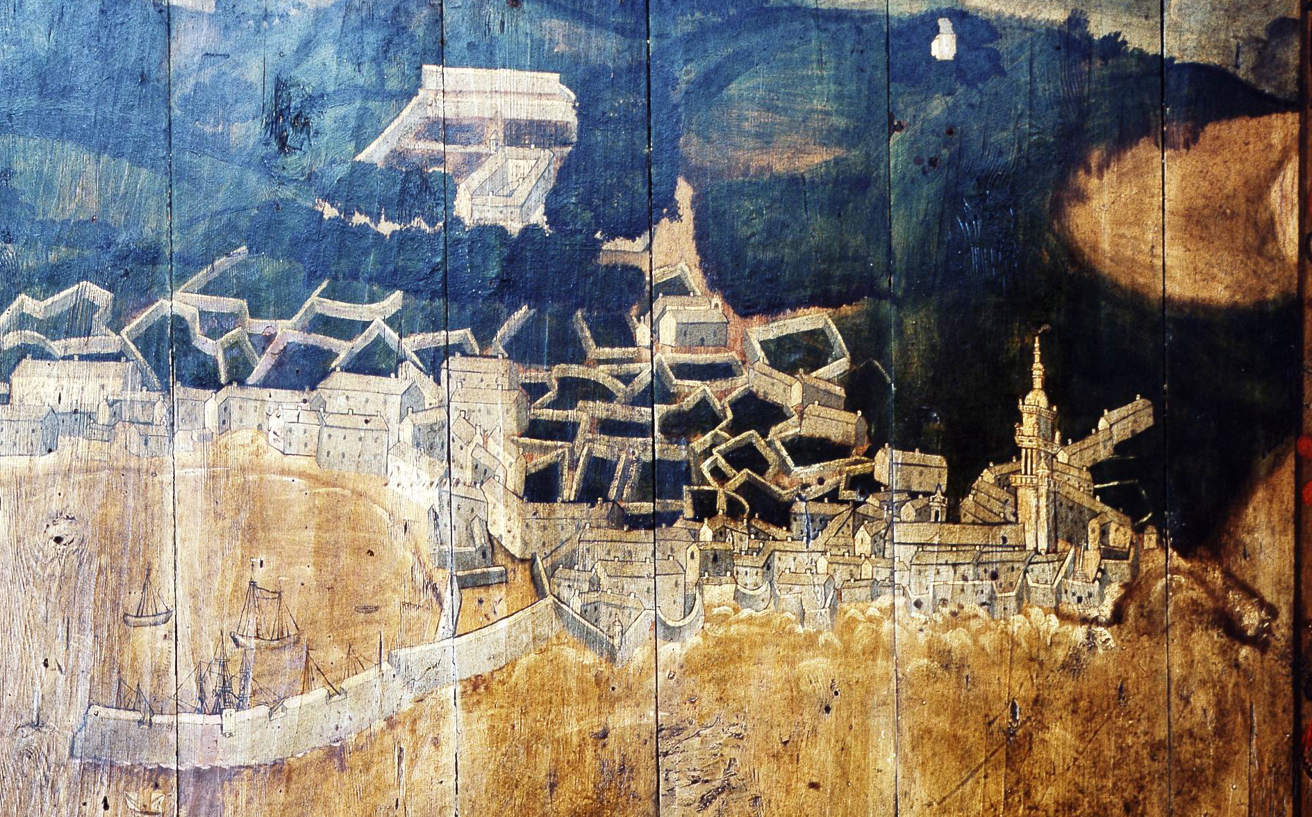Représentation du port de Roscoff au 18e siècle (détail d'une peinture sur bois réalisée dans une maison de marchand de Roscoff datée de 1603)Immatriculation