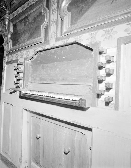 Orgue, vue du clavier, registre de chaque côté, photographie de 1987Immatriculation