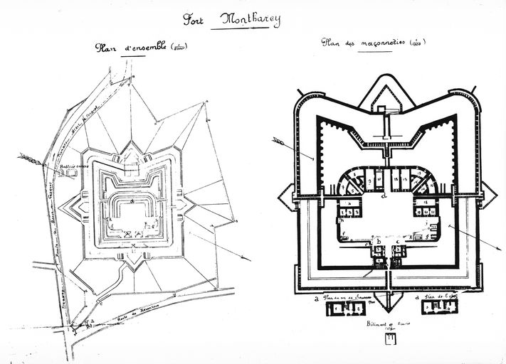 Plan d'ensemble et plan des maçonneries du fort MontbarreyImmatriculation