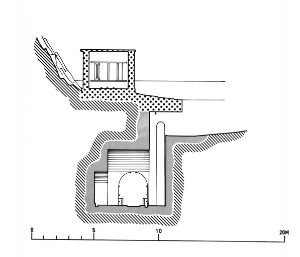 Coupe de l'abri de combat et de jour sous roc pour projecteur de l'îlot des Capucins. Au dessus se trouve le poste photoélectique (aujourd'hui ruiné)Immatriculation