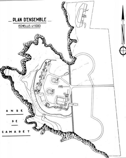 Plan d'ensemble de la batterie de Trémet transformée en batterie de défense contre avions (DCA) en 1955. Au nord de cette position : la batterie annexe de Tremet (4 canons G de 95 mm sur affûts G de côte)Immatriculation