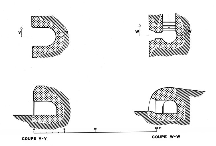 Coupes et plans des entrées (V-V et W-W) du magasin à poudre sous roc de la batterie de TremetImmatriculation