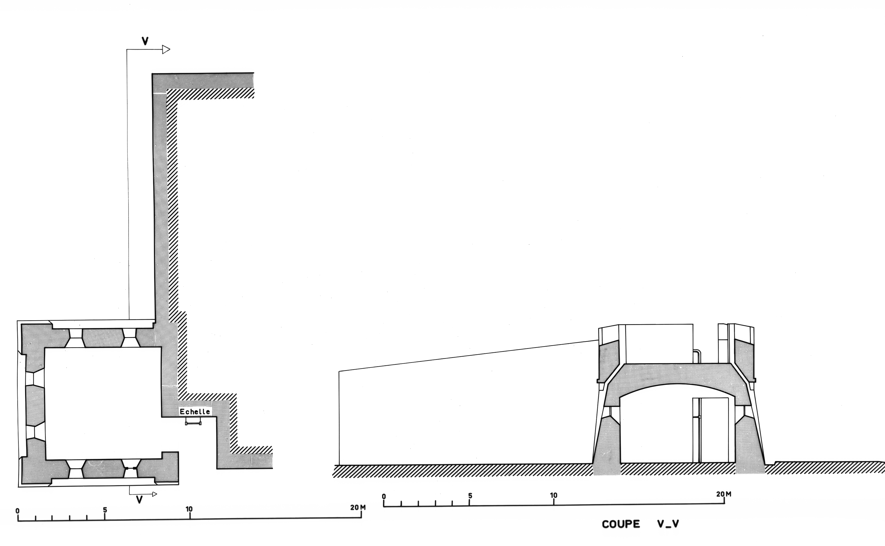Plan et coupe V-V de la batterie de mortier : tour de défenseImmatriculation