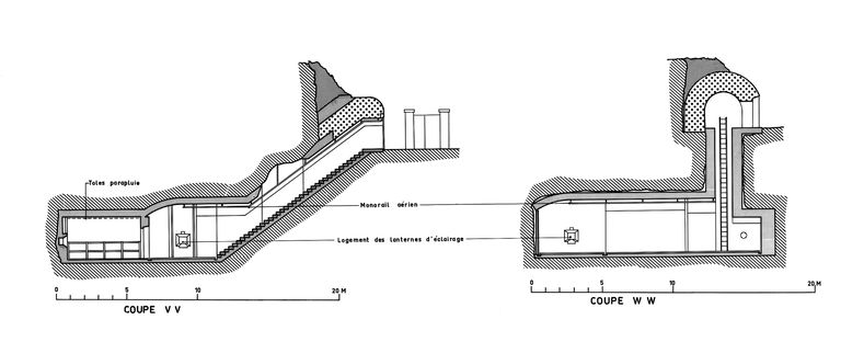 Coupes V-V et W-W du magasin à poudre sous roc des batteries des Capucins à Roscanvel (escalier, monorail aérien, tôles parapluie, logement des lanternes d'éclairage)Immatriculation